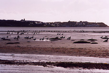 Wenn ich mich richtig entsinne, war es am Abend des gleichen Tages, an dem wir uns Duniveg angesehen haben. Auf der Rückfahrt am Loch Indaal vorbei kamen die Nonnengänse und auch vereinzelte andere Gänsearten zum großen Neuigkeitenaustausch zum großen Sandstrand von Loch Indaal. Immer wieder kommen große Schwärme an und zwingen die schon sitzenden zur Neuordnung.